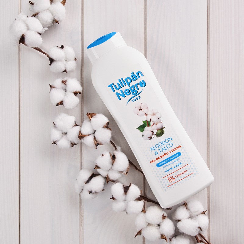 THE Tulipán Negro Cotton & Talc Shower Gel 650 ml It gently cleanses the skin while leaving a delicate and reassuring fragrance. Inspired by the freshness of clean laundry, it combines notes of pure cotton and powdery talc for an immediate feeling of comfort.