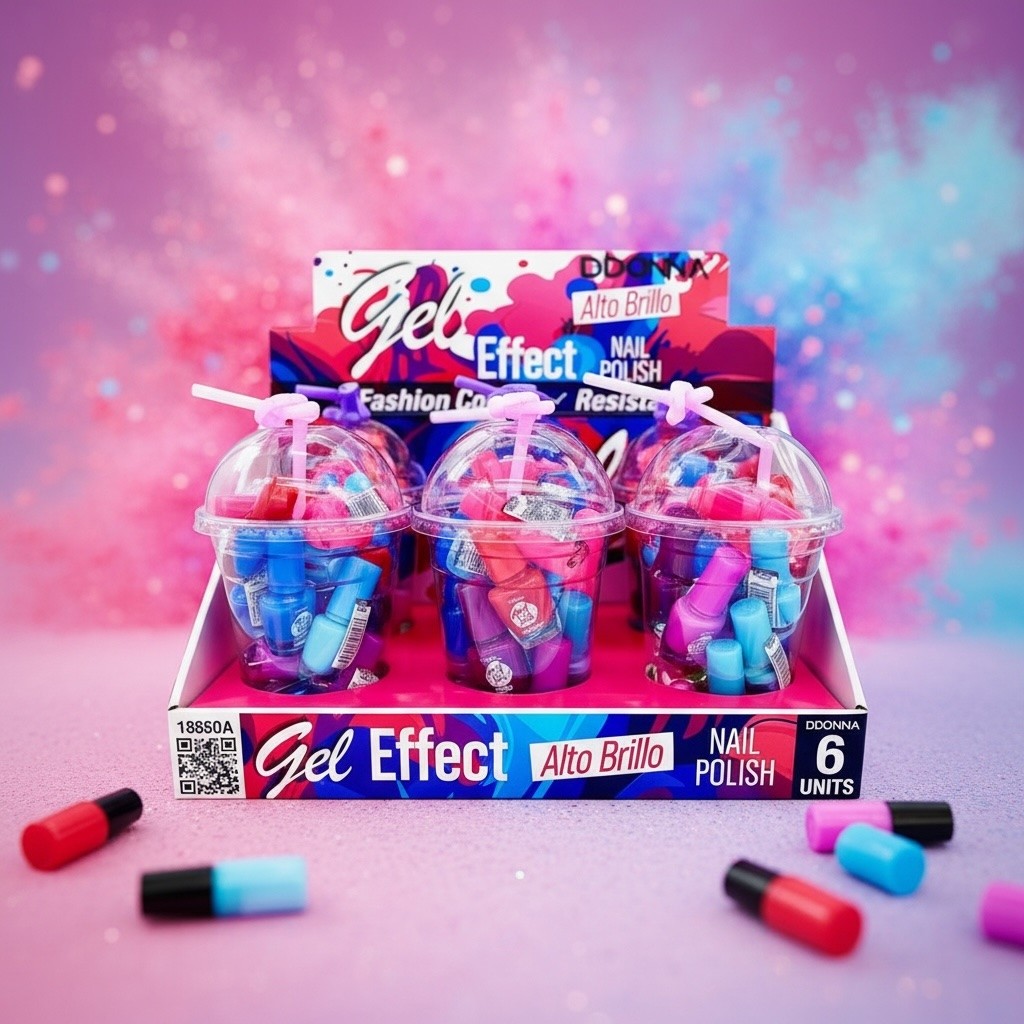 The D'Donna Milkshake Nail Polish display is an original and playful concept, designed to maximize visual impact in stores and boost sales quickly. Presented in the form of transparent "Milkshake" cups with decorative straws, it immediately catches the eye and encourages purchase.