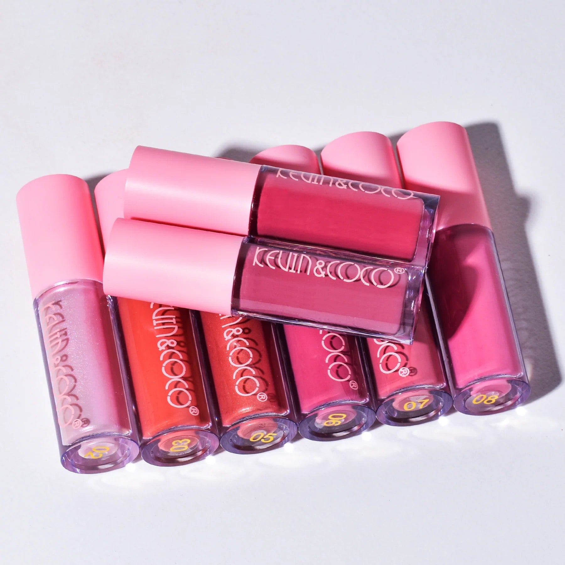 Give your lips shine and color with the Glossy Collection from KEVIN & COCO. This elegant set of 8 glosses is ideal for creating a variety of looks, from natural nudes to bolder shades, while providing hydration and shine.