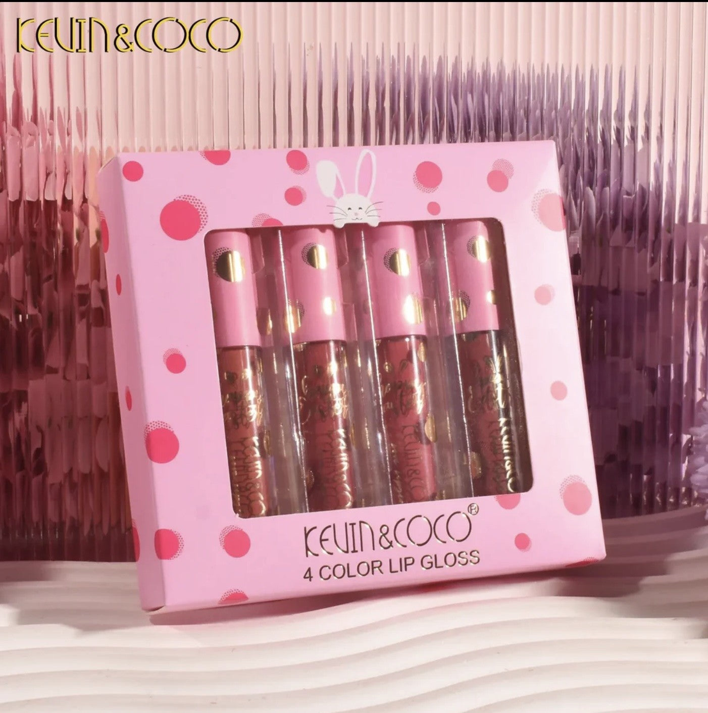 Craquez pour ce set de 4 gloss signé KEVIN & COCO, idéal pour des lèvres brillantes, hydratées et glamour en toute occasion. Présentés dans un adorable packaging rose à pois avec petit lapin, ces gloss sont parfaits pour un usage personnel ou pour la revente.